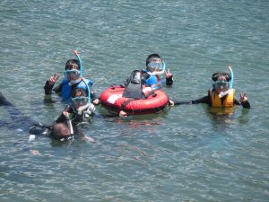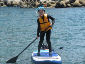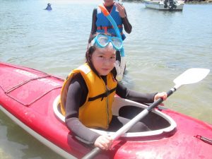 1日目は、シュノーケリング体験、カヤック、サップをしました。初めて体験することもあり不安がる子もいましたが、最後は笑顔で楽しむことができ、いい経験になりました。