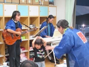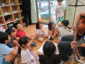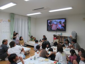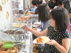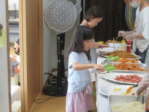 夏休み始まってすぐ、親子食事会を行いました。雷雨の為、急遽室内での開催となりました。バイキング形式で好きな食べ物、飲み物を選んだらまずは自由にお話。また、職員による楽器と歌の演奏を行いましたが、子ども達は普段見ない職員の姿に驚いたり大笑いしたりしている様子でした。保護者の方は一緒に歌って盛り上げて下さり、わいわい、にぎやかな親子食事会となりました。