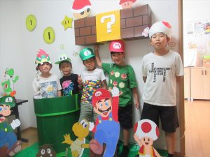 8月21日はキュリオで夏祭りを行いました。まずはキュリオ映画館へ、ポップコーンやジュースを飲みながら映画鑑賞をしました。お昼はバイキング。午後からは職員手作りの髪飾りや帽子、顔にシールなどを貼ってオシャレに変身し、マリオやすみっコぐらしの世界に飛び込み、子ども達は終始はしゃいだ様子でした。